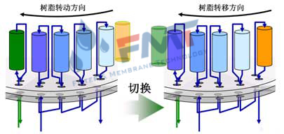 而物料通過一個(gè)自動(dòng)旋轉(zhuǎn)分配法控制,把樹脂柱分成交換、水洗、再生、漂洗等功能區(qū)域,當(dāng)樹脂單元到達(dá)指定區(qū)域就執(zhí)行相應(yīng)的工藝過程,這樣可以實(shí)現(xiàn)每個(gè)過程獨(dú)立進(jìn)行,而整體工藝成連續(xù)運(yùn)行。