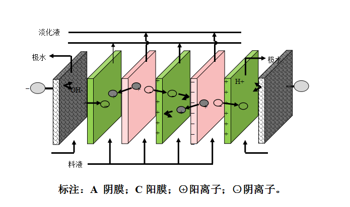 離子交換膜是由高分子材料制成的對離子具有選擇透過性的薄膜。主要分陽離子交換膜(CM,簡稱陽膜)和陰離子交換膜(AM,簡稱陰膜)兩種。陽膜由于膜體固定基帶有負(fù)電荷離子,可選擇透過陽離子;陰膜由于膜體固定基帶有正電荷離子,可選擇透過陰離子。陽膜透過陽離子,陰膜透過陰離子的性能稱為膜的選擇透過性。電滲析過程最基本的工作單元稱為膜對。一個膜對構(gòu)成一個脫鹽室和一個濃縮室。一臺實(shí)用電滲析器由數(shù)個膜對組成用夾緊板緊固在一起的膜堆部分稱為電滲析,要進(jìn)行工作,必須有水泵、整流器等輔助設(shè)備,還必須有進(jìn)水預(yù)處理設(shè)施。通常把電滲析及輔助設(shè)備總稱為電滲析裝置。