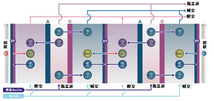 雙極膜電滲析設(shè)備是由雙極膜、陰膜和陽膜組成的3室式電滲析設(shè)備,通過供給無機(jī)鹽(Na2SO4),陰離子(SO42-)透過陰離子交換膜和在雙極膜分解成的H離子(H+)結(jié)合成酸(H2SO4),另一方面,陽離子(Na+)透過陽離子交換膜和在雙極膜分解成的OH離子(OH-)結(jié)合成堿(NaOH)(進(jìn)行中和逆反應(yīng))。