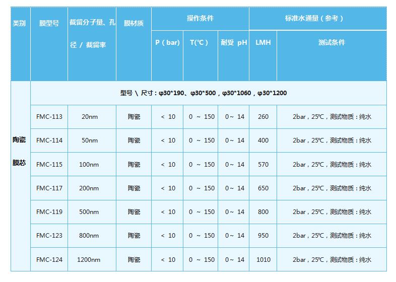 無機陶瓷膜是以氧化鋁、氧化鈦、氧化鋯等經高溫燒結而成的具有多孔結構的精密陶瓷過濾材料,多孔支撐層、過渡層及微孔膜層呈非對稱分布,過濾精度涵蓋微濾、超濾、納濾。陶瓷膜過濾是一種“錯流過濾”形式的流體分離過程:原料液在膜管內高速流動,在壓力驅動下含小分子組分的澄清滲透液沿與之垂直方向向外透過膜,含大分子組分的混濁濃縮液被膜截留,從而使流體達到分離、濃縮、純化的目的。廈門福美科技有限公司提供的陶瓷膜過濾精度覆蓋微濾和超濾級別,微濾過濾孔徑0.05μm-0.14μm,超濾過濾精度10KD-50KD.