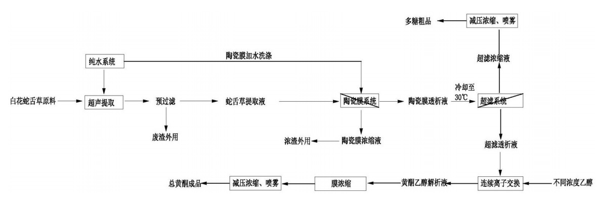 為達(dá)到上述目的,本發(fā)明提出的技術(shù)方案為:一種從白花蛇舌草中分離純化黃酮、 多糖的系統(tǒng),其特征在于:包括依次連接的超聲波提取裝置、預(yù)過(guò)濾裝置、陶瓷膜設(shè)備,所述的陶瓷膜設(shè)備的透析液出口連接超濾膜設(shè)備;所述的超濾膜設(shè)備的濃縮液出口連接第一減壓濃縮、噴霧裝置,透析液出口連接連續(xù)離子交換及色譜分離裝置,所述的連續(xù)離子交換及 色譜分離裝置的解析液出口依次連接膜濃縮設(shè)備、第二減壓濃縮、噴霧裝置。 所述的膜濃縮設(shè)備為納濾膜設(shè)備、反滲透膜設(shè)備或正滲透膜濃縮設(shè)備。