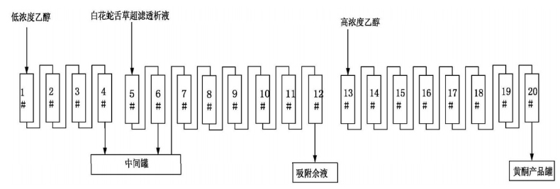 5:超濾透析液進(jìn)入填裝有大孔吸附樹(shù)脂的連續(xù)離子交換及色譜分離裝置中 ,通過(guò) 在連續(xù)離子交換設(shè)備的不同功能區(qū)域,通入不同濃度和pH的乙醇解析劑,得白花草黃酮的乙醇解析液;