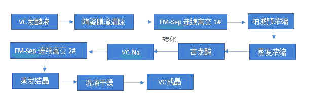 廈門福美科技有限公司開發(fā)基于陶瓷膜技術(shù)及納濾膜濃縮技術(shù)與連續(xù)離子交換技術(shù)結(jié)合的生產(chǎn)工藝,工藝流程如下圖所示: